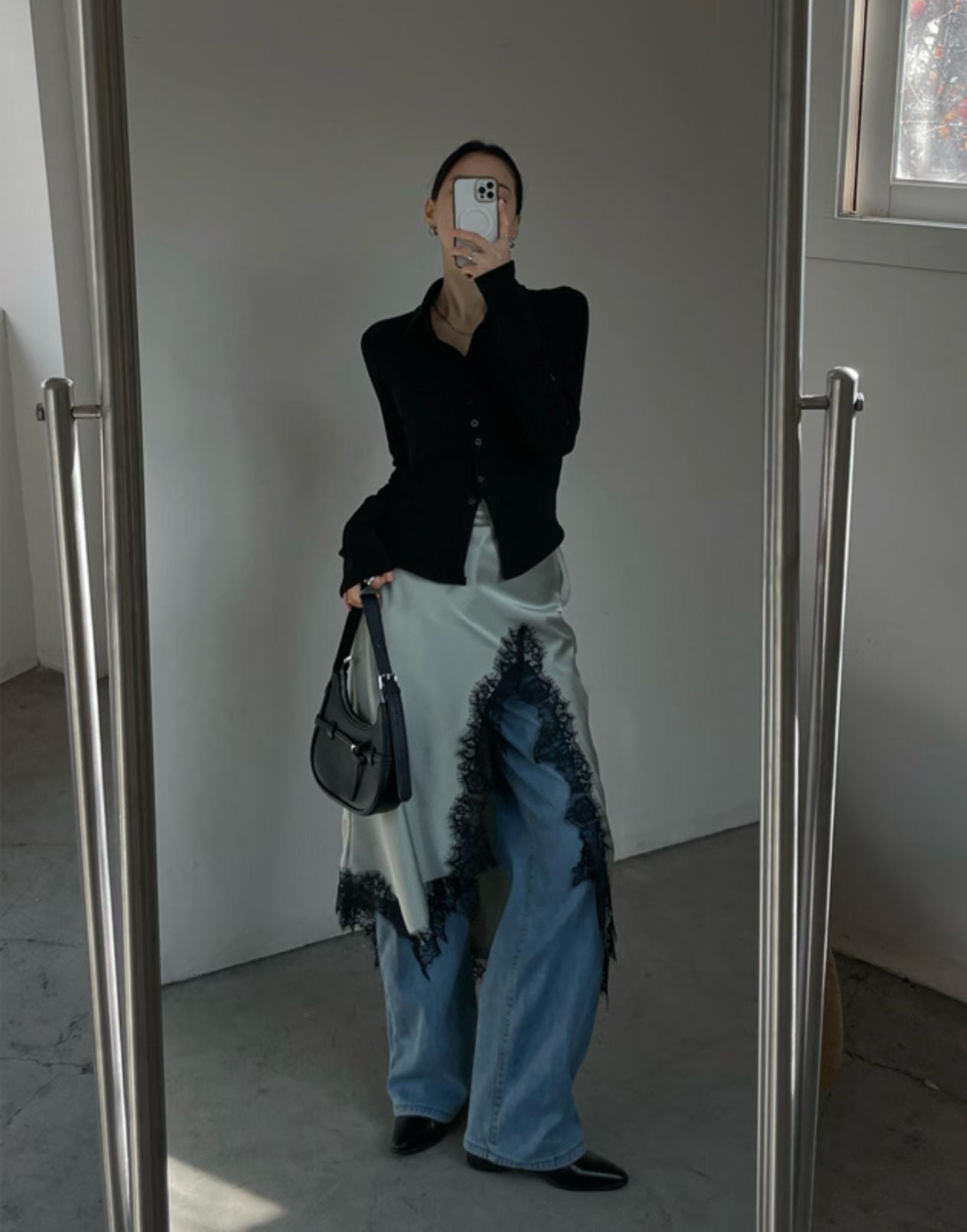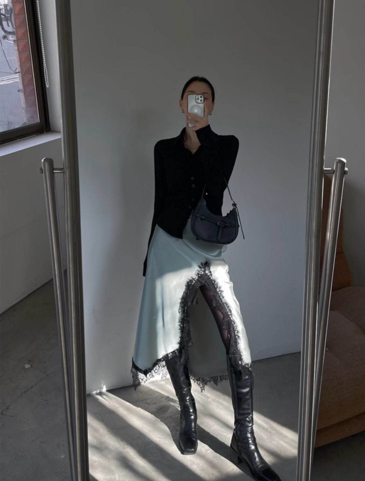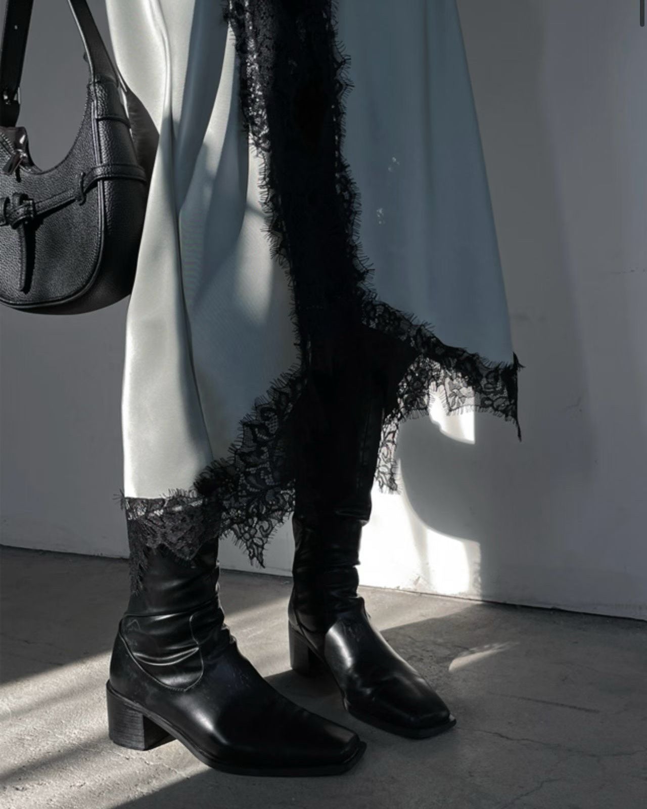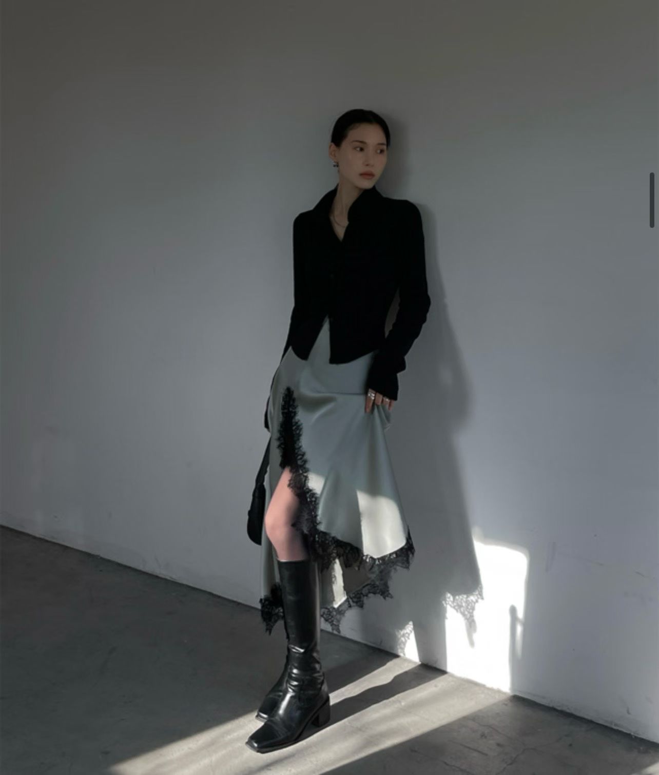 緞面光澤蕾絲開叉半身裙