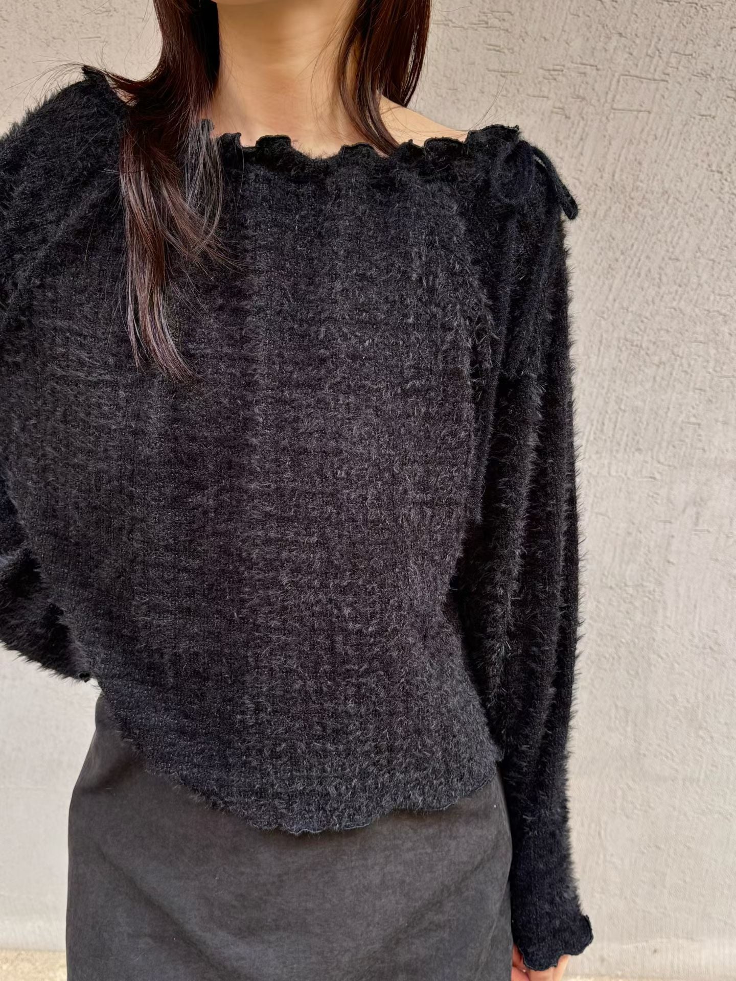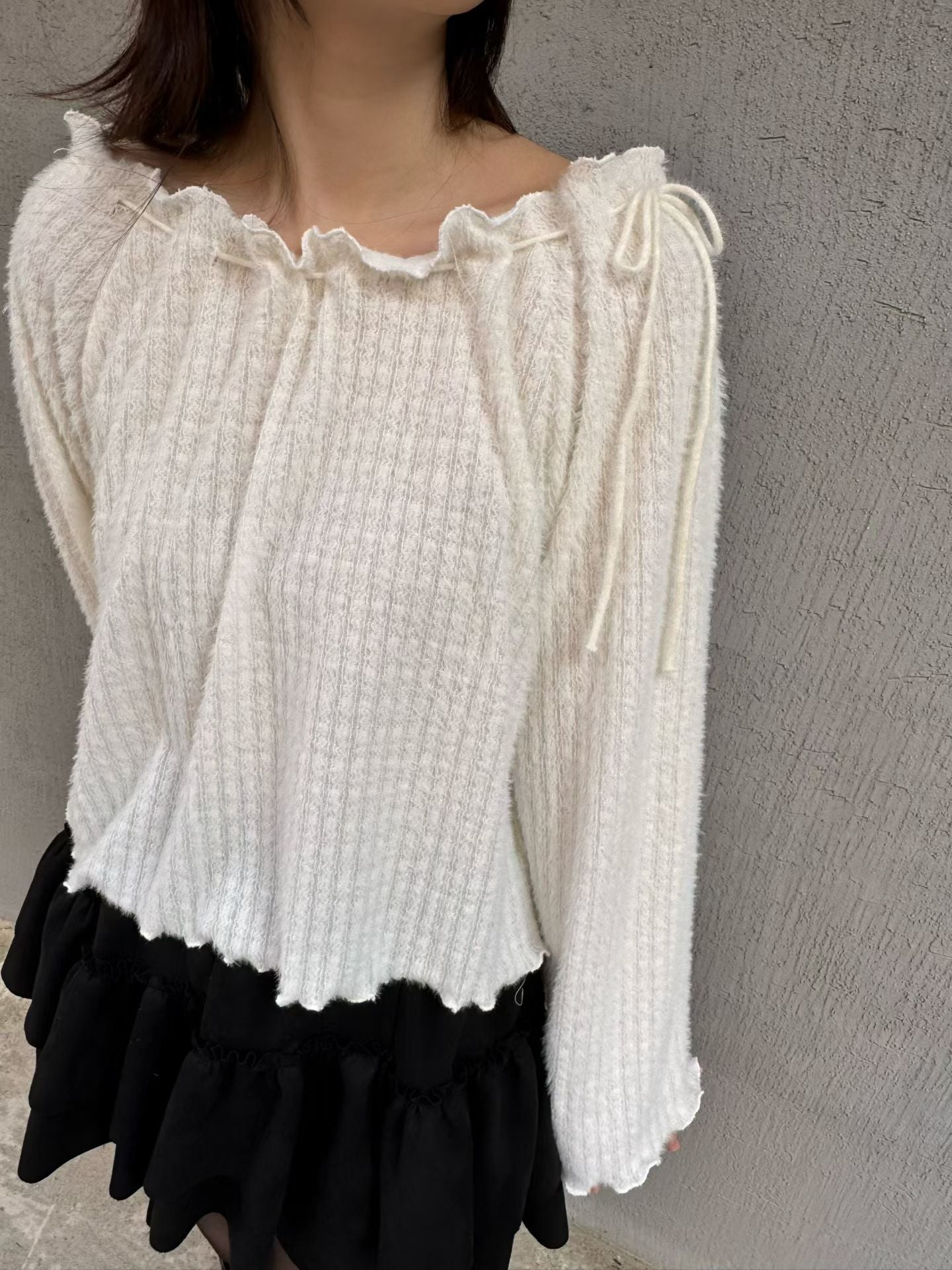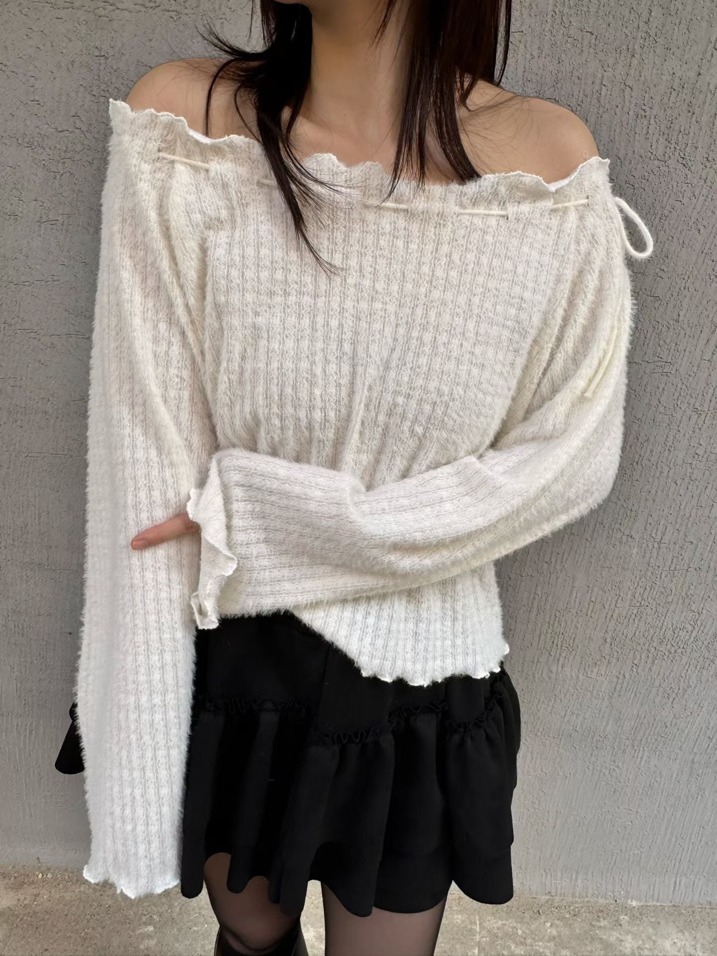 露肩滑身毛料綁帶上衣