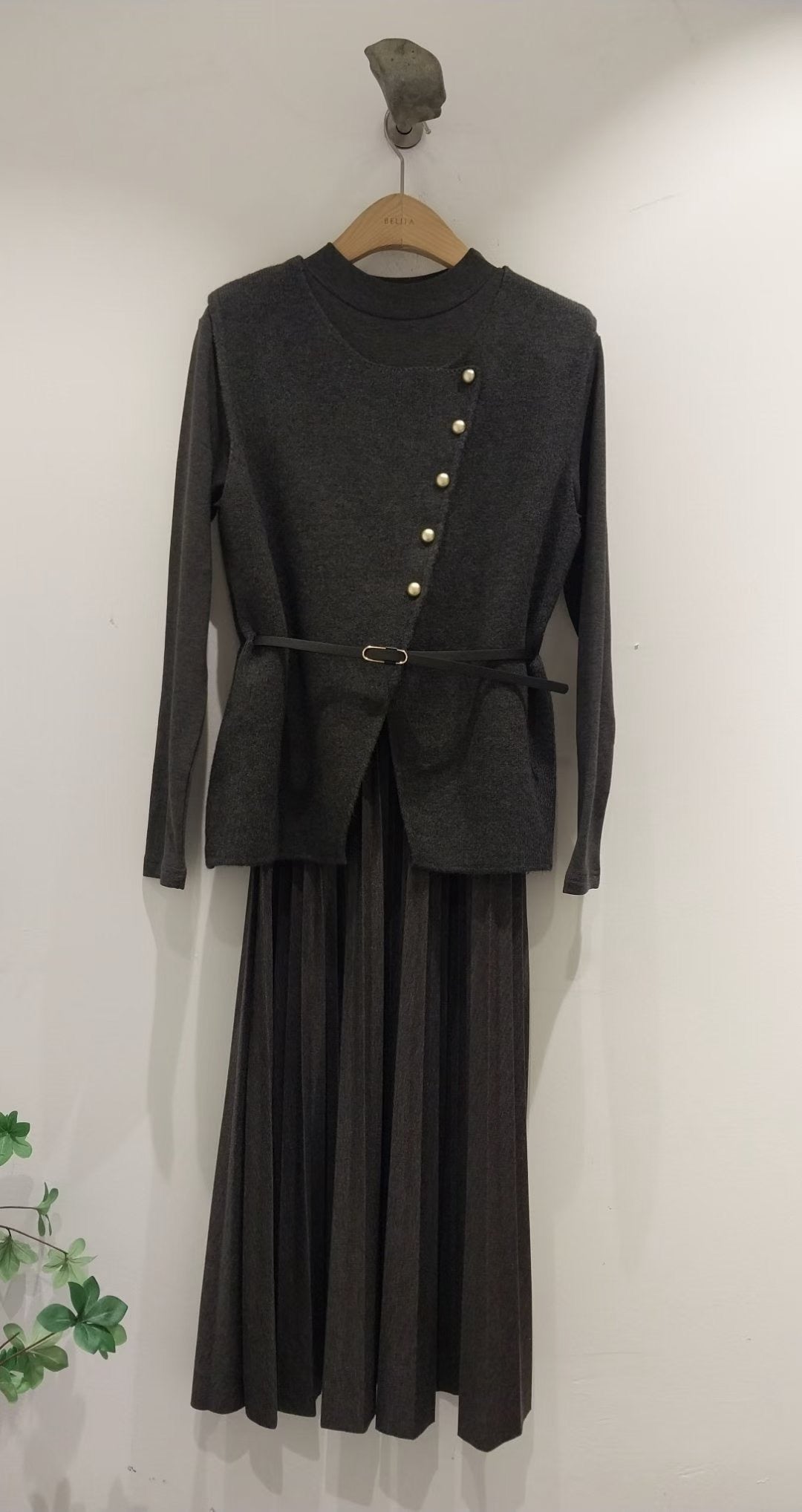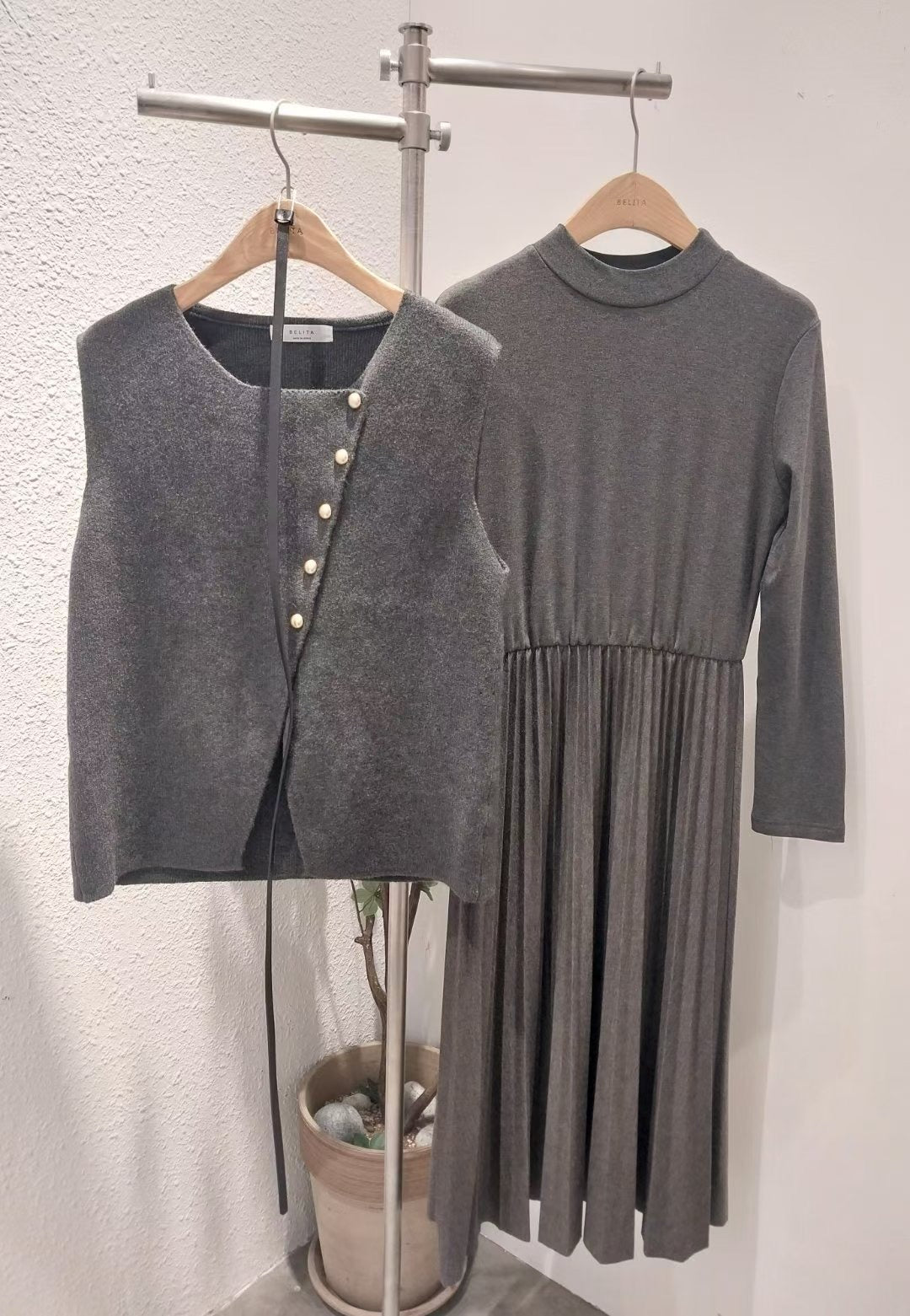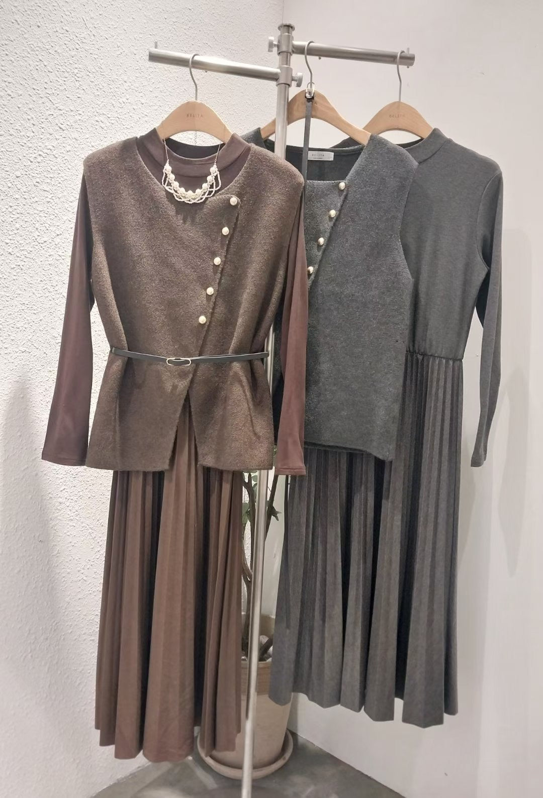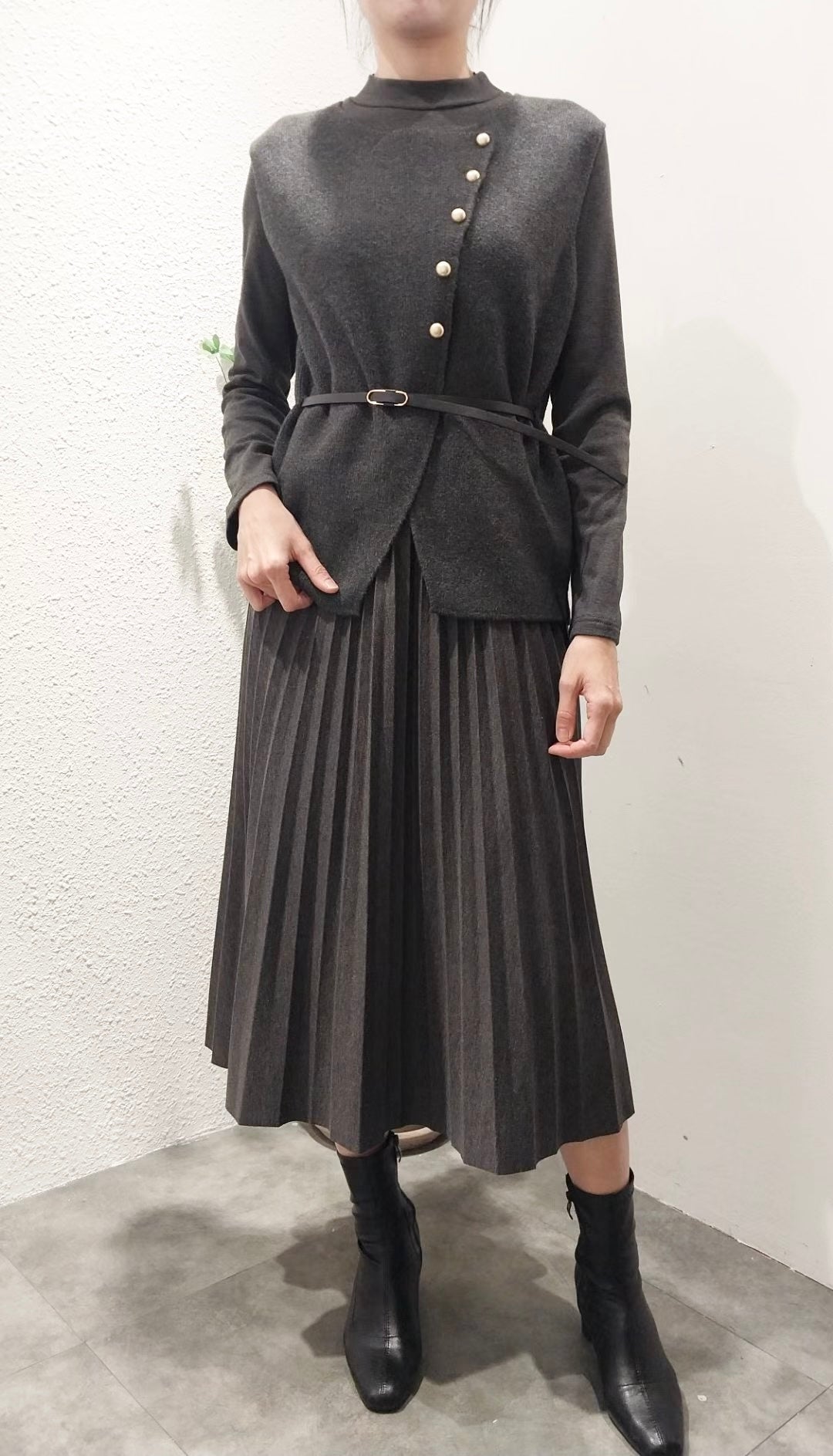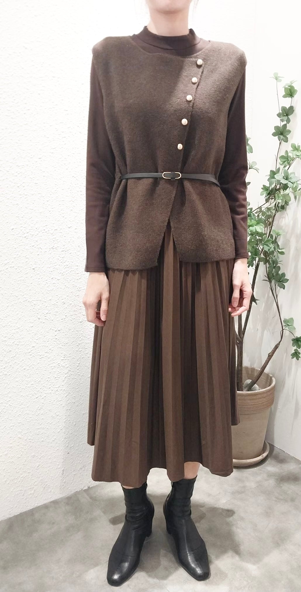 毛呢馬甲拼百褶連身裙套裝